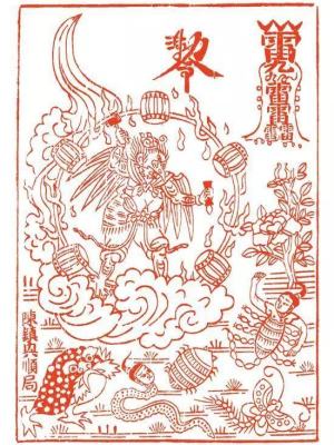 雷公人知击五毒,民间纸马,陕西施法凤翔《西游记》中倒是有与之相关的一个说法,可以窥见“雷劫”之说的早期状态。说第二回石猴学艺须菩提,须菩提告知以雷、火、风“三灾”:“丹成之后,鬼神全套难容。虽驻顔益寿,但到了五百年后,天降雷灾打你,须要见性明心,预先躲避。躲得过寿与天齐,躲不过就此绝命。再五百年后,天降火灾烧你。这火不是天火,亦不是凡火,唤做阴火。自本身涌泉穴下烧起,直透埿垣宫,五臓成灰,四肢皆朽,把千年苦行,倶为虚幻。再五百年,又降风灾吹你。这风不是东南西北风,不是和熏金朔风,亦不是花柳松竹风,唤做鸹风。自囟门中吹入六腑,过丹田,穿九窍,骨肉消疎,其身自解。所以都要躲过。”