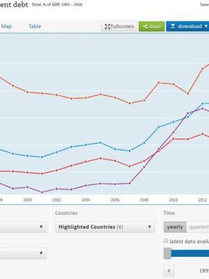 德(红色)、法(蓝色)、英(紫色)、意(黄色)四国债务占国内生产总值比重(来源:OECD网站)(点击译成看大图)