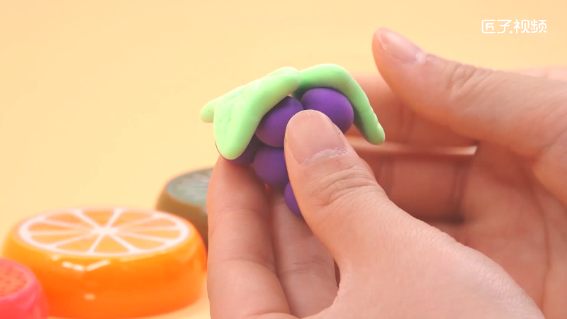 3、最后再做一个叶柄,然后粘上去,这样葡萄就做好了,最后再做出其他水果。