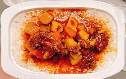 自热米饭里面有米饭、菜、热菜的发热包、专用热菜水包。首先,当然是把自热包打开,放到饭的外盒最底部。打开米饭盒,里面的米是脱过水的干米饭。自带的水倒入放着加热包的外盒内,把米饭放在加热包上。
