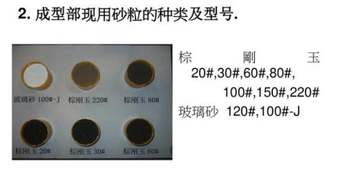 3、磨料形状有球形和菱形两类,在其他参数设定后,球形磨料得到的表面更光滑。同一种磨料有不同的粗细,一般按筛网数目划分粗细度,成为多少号。号数越高,颗粒度越小,表面越光滑。