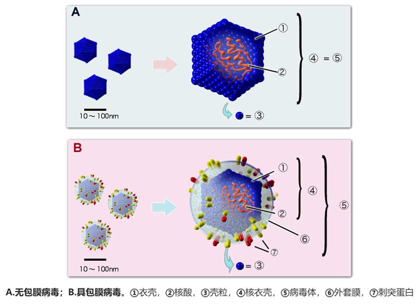 病毒没有细胞结构,它们的DNA或者RNA由蛋白衣壳包裹,结构十分简单。当病毒入侵细胞时,可以利用宿主的物质进行自我复制,从而延续它们的遗传密码。