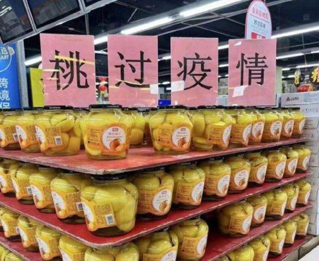 在一张广为流传的超市黄桃罐头堆头陈列图片中,堆头文案“桃过疫情”不仅在社交平台上引发多次共情,还让人们把黄桃罐头抢购一空。