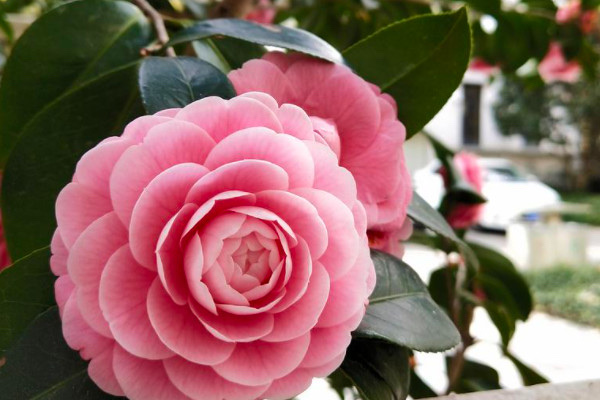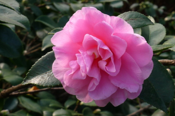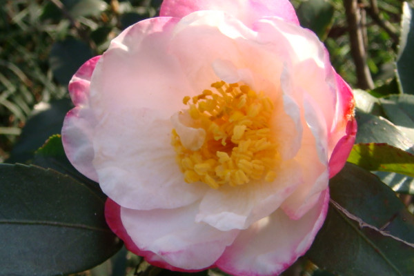 双色茶梅在花朵颜色上和小玫瑰相似,但是花瓣带有白色的斑块。