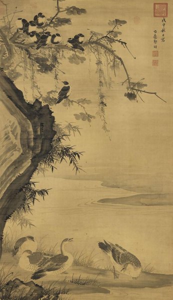 烟水寒汀,沙岸栖雁三只,一缩项瞑目状似憩息,二引首顾侧,若守望警戒。岸旁惟见芦苇三五,情景萧瑟,撩人寒思。本幅中雁之造型、用笔及芦雁之笔法,有明中叶著名的宫廷花鸟画家吕纪(活动于1439─1505)之意。然皴石未见其常用之斧劈皴法,画雁之笔平整,又芦苇与石之线条较有起伏提顿,尤以水纹最为明显,故或为后之仿吕氏者所作。