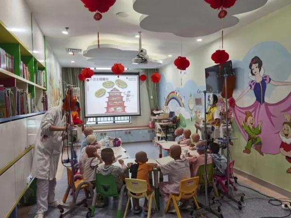 但只有等到上课时,教室里挂起的输液瓶、需要被消毒的教具,以及坐在教室里的一个个光着小脑袋、戴着口罩的学生,就能让人感受到这间教室的特殊性。