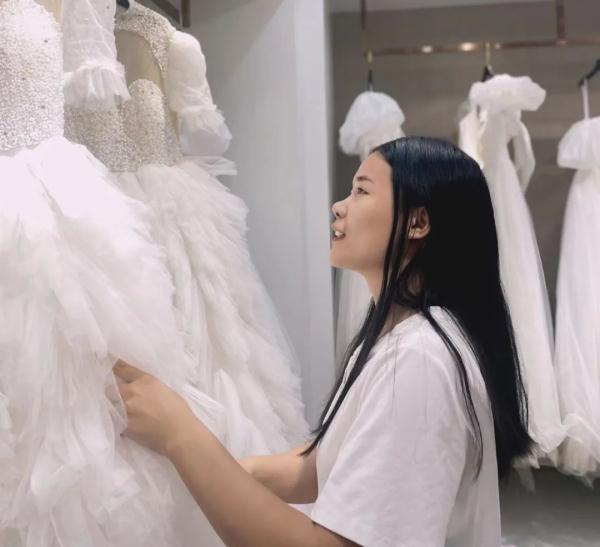 潘晓霞正在为拍婚纱照挑选婚纱。