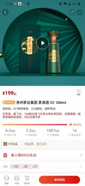 除了有品有鱼上销售的台源智酒之外,小米有品上还有茅台王子酒、茅台飞天酒、茅台赖茅、茅台贵州大曲、茅台迎宾酒等多个品类正在销售。此外,小米有品上还有一款“茅源酒53度500ml酱香型白酒”正在做众筹,目前众筹金额已经达到1687万元。