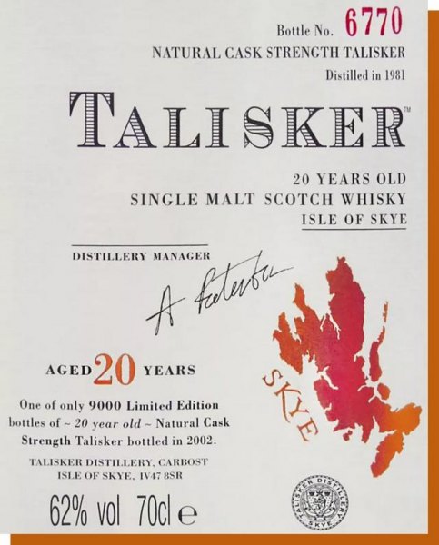 酒厂的名字一定会被印在最醒目的地方,比如第一张酒标方框 ⑤ 中的 Lagavulin,以及上面的这张图的 Talisker。同时调和威士忌(Blended)或者单一麦芽威士忌(Single Malt Whisky)也会在酒标上写明,这样消费者可以知道自己到底买的是哪种威士忌。