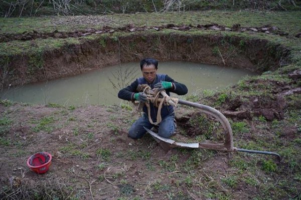 村民王朝洪说,他在2015年曾看到过水牛突然陷落农田的事,“牛的肚皮搭在坑边,脚全沉下去了,好几个男人才把牛拽上来”。
