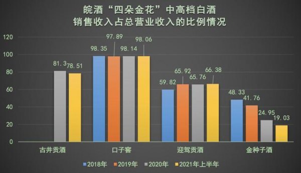 从内部看,“二八效应”明显,皖酒霸主古井贡酒一家独大。以2021年上半年经营情况为例,古井贡酒以70.07亿元营业收入、13.79亿元净利润位列第一;第二和第三的口子窖、迎驾贡酒,上半年营业收入仅为古井贡酒的三分之一,净利润亦随之腰斩;更别提近年来长期亏损的金种子酒了。