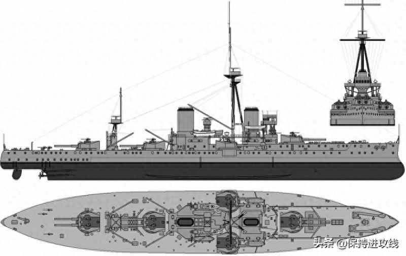 “无畏”级长160.6米,宽25米,吃水9米。排水量标准18410吨/满载23060吨。最大航速21节。装备5座305毫米双联装炮塔,中轴线上前1后2,两侧还有并列的2座。这样同侧可以发挥8门主炮的火力,而舰艏和舰艉方向可以发挥6门。此外该舰还有27门76.2毫米副炮,5具450毫米鱼雷发射管(为何看不到鱼雷发射管?因为那时候战列舰鱼雷发射管都在水线下面)。