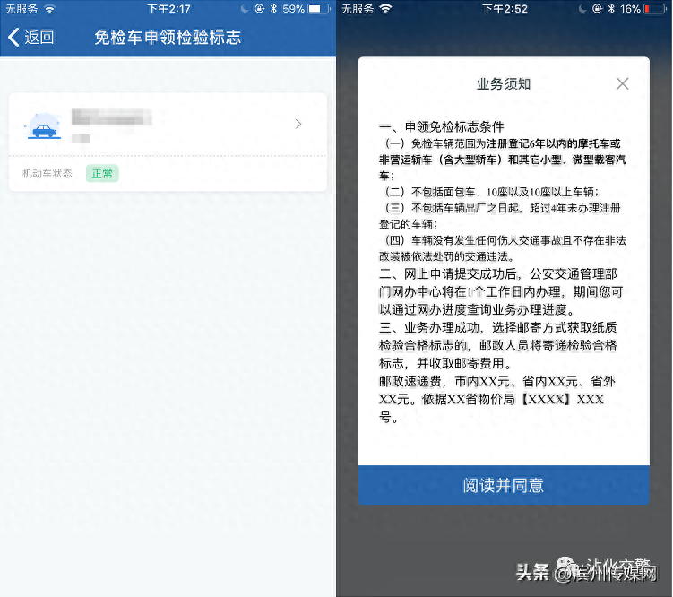 用户选择需免检车申领检验标志的机动车。认真阅读免检车申领检验标志业务须知后,点击【阅读并同意】进入车辆信息确认页面。对于交强险和车船税联网核查是否通过的,分别进入两个不同的业务操作流程。