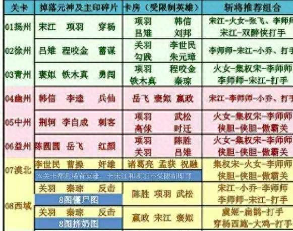 然后等到你有了五星宋江你就可以开始往后面推图,有了五星宋江后面的图基本上就容易推到八图,当推图推到了图八的时候你就又要停下来卡八图了,一定要把八图的门神刷出来。有了五星门神就是卡九图,图九有一个起义陈胜,你可以把陈胜打造成一个乌龟,以至于后面的推图。当你拥有了五星宋江、五星陈胜、五星门神了你就可以考虑刷图刷打手,打手在十一图,你就可以卡在十一图,刷打手。