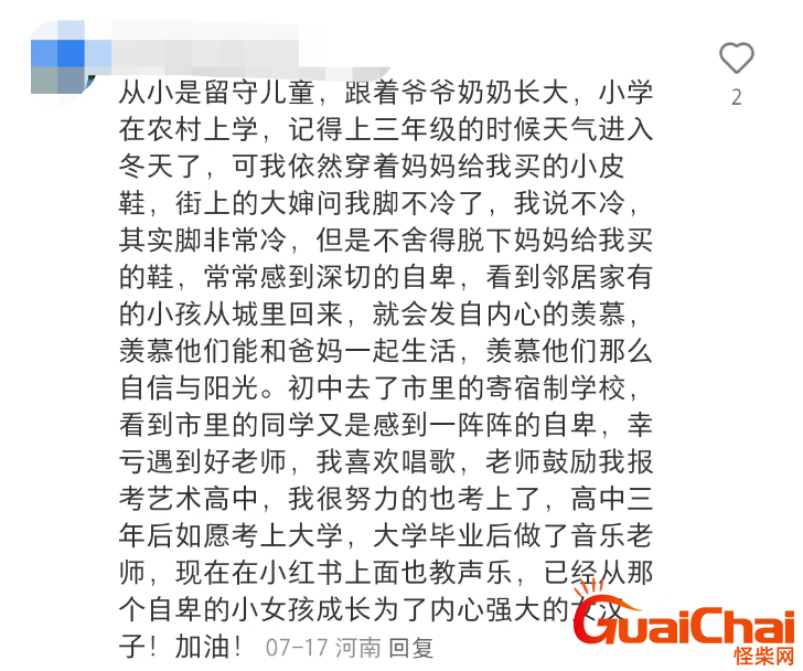“从小是留守儿童,贫穷又自卑,但是遇上了一个好的老师,同时努力学习考上大学,长大成为了内心强大的女汉子。”