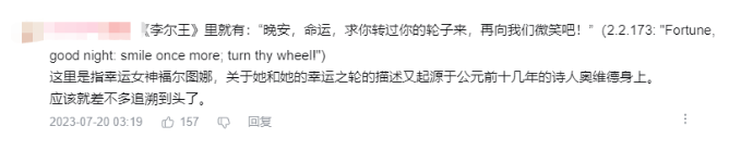 甚至再早一些,有网友还追溯到这句话改编自《李尔王》的一句话:“晚安,命运,求你转过你的轮子来,再向我们微笑吧!”