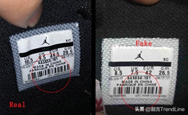 1,Real鞋标的烫印部位比较透明,Fake的比较白不透明(就是标四周凹下去的部位)