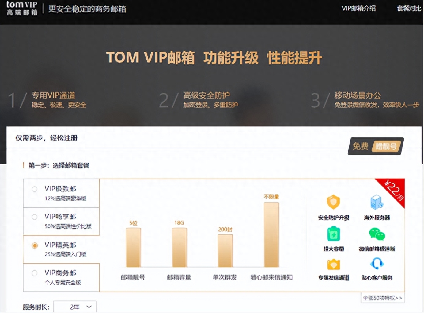相对于普通邮箱而言,电子邮箱更加方便快捷,在互联网时代,只要知道对方的电子邮箱地址,发给对方的邮件不到一秒钟就可以收到。TOM VIP邮箱有自己专属的收发信通道,安全稳定,保密性也强,支持群发单显,误删恢复、邮件撤回、移动办公等多项实用功能,是目前很多商务人士职场办公及个人沟通首选的邮箱。