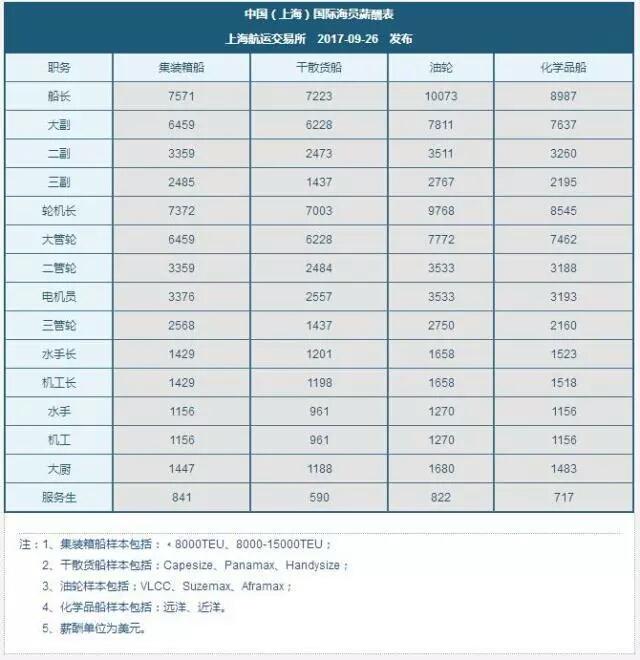 上图是上海航运交易所发布的2017年9月份船员工资表,这个表格应该是根据远洋船员的工资进行制作的。船员包括远洋船员,近洋船员,还有内河船员。当然工资也是不一样的,远洋船员的工资相对高,因为航线不定,航行时间有长有短,船员要求也相对较高。就远洋船员来说,常见船型主要是散货船,集装箱船,油化船和液化气船。散货船又按照大小分为灵便型,巴拿马型和超大型散货船。散货船对于集装箱船来说船速较低,所以航行时间相对长,到达港口后停靠时间也较长。散货船一般在港口时间长的可以停靠一个星期,可以有充足时间下地游玩购物,这是集装箱船员比较羡慕的。集装箱船航行速度相对较快,一般短的一天一靠港甚至一天多次靠港,这无论是对于驾驶员还是轮机员都是不好的因为都需要值班,特别是机舱的船员每到港口都要按照计划对设备进行紧急修理,现在集装箱码头装卸效率非常高,短的船舶停靠20个小时左右就要离港。油船货物不仅仅是原油也包括成品油,菜籽油等,不同船东工资差别也不少,同一个船东不同系列船舶工资也有差别。液化气船舶这里没有提供工资,但是也可以参考上述油船工资标准。对液化气船员安全要求很高,因为其货物的特殊性。相对于其他船员来说提职相对慢一些但是同时工资也具有很大优势,一个液化气船东给俄罗斯船员的工资标准船长高达1.5W美金。
