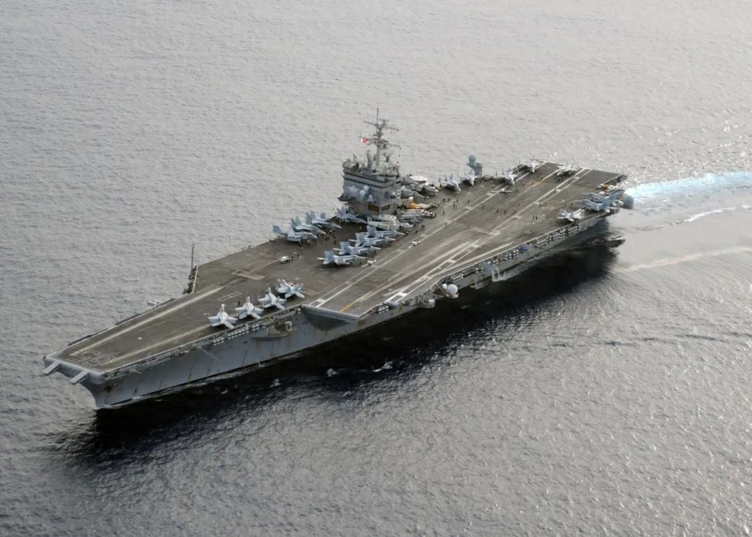 艾森豪威尔号1970年开工建造,1975年下水,1977年开始服役,参与过沙漠风暴行动。它满载排水量约113800吨,全长约332.9米,最大甲板宽约76.8米,最高航速30节以上,舰载机数量约为90架。