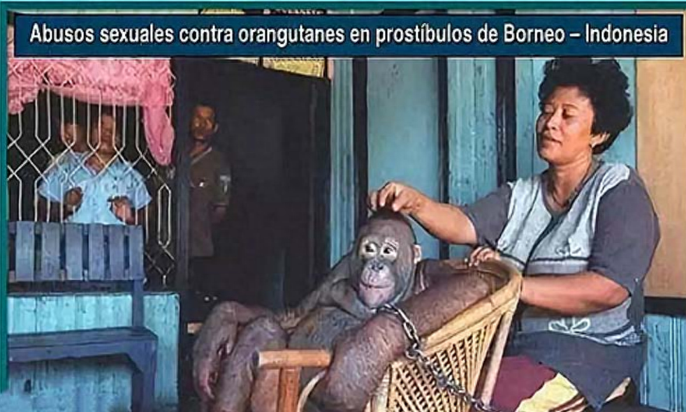 “是的,很多人就是冲着它来的。如果你喜欢,你可以选择一个人,但是和猩猩发生性关系会让很多男人感到新奇。他们每天会给她剃毛,这意味着它的皮肤会长些丘疹,非常恼人。蚊子也会很容易叮咬到她。她不断的抓挠,他们甚至还给她戴上了戒指和项链,这使它看上去非常惨不忍睹。但是印尼并没有关于胁迫猩猩卖淫的法律,这些人也无须遭受任何处罚。”