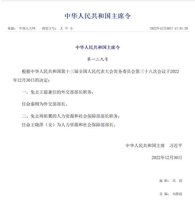 据央视《新闻联播》12月30日消息,第129号国家主席令说,根据中华人民共和国第十三届全国人民代表大会常务委员会第三十八次会议于2022年12月30日决定,免去王毅兼任的外交部部长职务,任命秦刚为外交部部长。