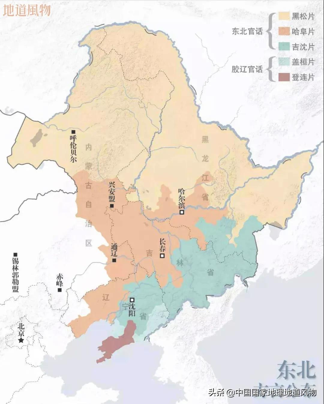 事实上,东三省方言分布错综复杂——黑龙江大部分地区方言属于黑松片,哈尔滨方言却属于哈阜片,与吉林松原话近似;吉林方言一半属于沈吉片,一半属于哈阜片,东西互不相同;更别提大连人根本不说东北官话,方言反而属于胶辽官话里的登连片……