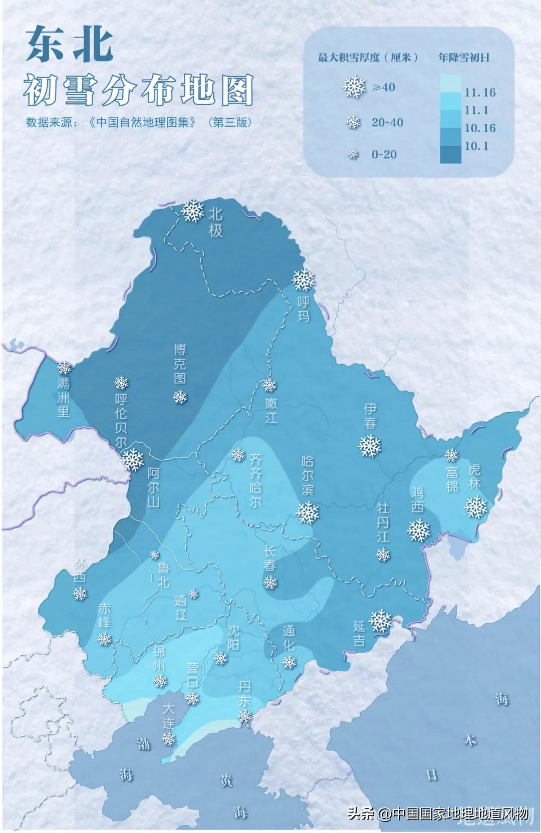 从中国最北的村庄北极村,到辽东半岛最南端的老铁山,东三省南北横跨了近15个纬度,相当于秦岭和海南岛的纬度之差。由此带来的热量差异,使得黑吉辽的气候也有了明显的区别——在哈尔滨已然大雪封门的时候,沿海的大连比同纬度的北京更加温暖。