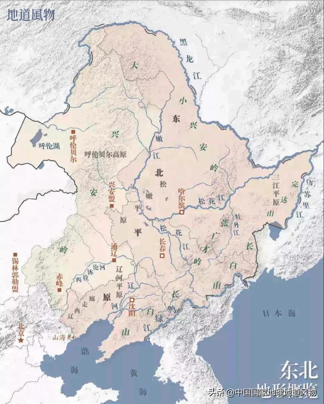 (东北地形图。东北地区除了东三省,还包括内蒙古东部的四盟、市。本文描述范围主要为黑、吉、辽三省。绘图/F50BB )