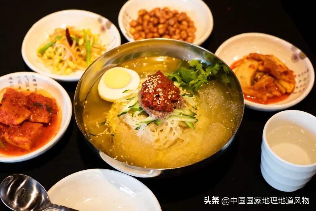 事实上,除却朝鲜半岛,中国东北同样是朝鲜族的聚集地之一。尤其是在吉林,几乎每个大超市里都有朝鲜咸菜的专柜,朝鲜族的灵魂料理“泡菜”又被称作“辣白菜”;而吉林的延边冷面可能比延边本身还要出名,在炎夏很多冷面店售卖带冰碴的冷面,冰凉的汤乍一入口,“唰”地一下,镇得后脖子清凉劲爽。