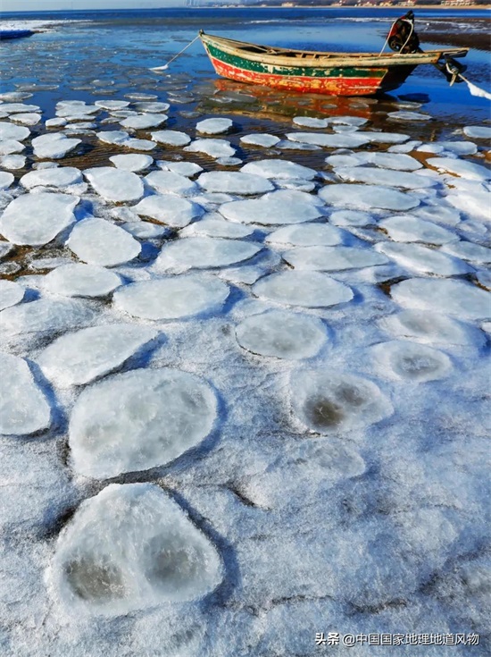 ▲ 冬季,渤海上出现的莲叶状的海冰 。摄影/邱会宁