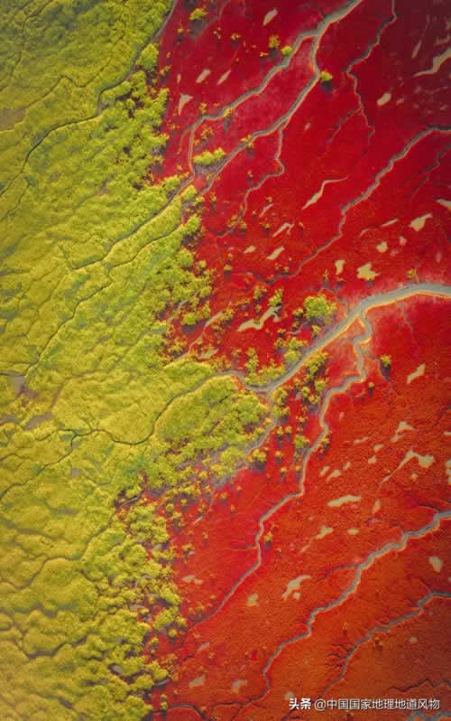 而在辽河入海口的盘锦,辽河、大凌河等搬运来的泥沙,在辽东湾北岸堆积出淤泥质海岸,使得耐盐碱植被在此旺盛生长。每年秋天,成片生长在这里的蓬碱草,逐渐由翠绿转变为鲜红,仿佛在海水中燃起了火焰,远远望去,海边的滩涂上铺开了一张厚厚的红毯。