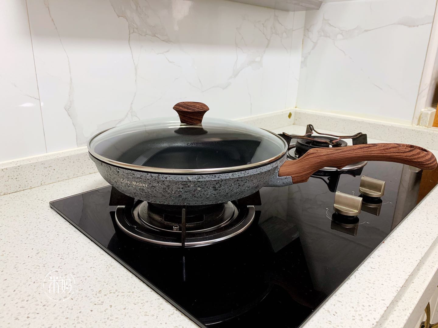 3、不粘锅的表面全部均匀的刷上一层薄薄的食用油(猪油和牛油除外)。我用的这款是钢化不粘锅,5层加厚不粘层,寿命比普通的麦石锅要长,复合锅底,多种炉灶通用,很实用!