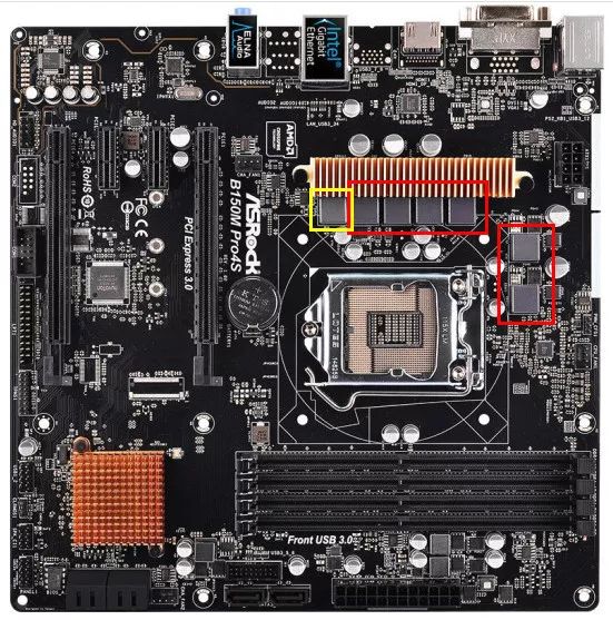 这张图圈出的地方,就是主板CPU的供电部分,一般普通的主板,数一下多少电感(就是图中那个四四方方的东西)就知道多少相供电,但是这不一定准备,因为有一些主板厂商会忽悠小白玩家只会数电感,而加上一些不关CPU核心供电的电感上去,如果要仔细甄别的话还得看看主板的的mos桥有没有和主板一一对应,一组mos桥是一上两下还是一上一下还是两三两下?像上图这张主板只有4+2六相供电,最下面的电感不是核心供电的。如果自己不想去研究自己的主板是多少相供电的,那么直接问一下主板厂商是多少相供电的?一般客服会如实回答的。(加粗)一般可以想要超频的主板,最好要有4+3或以上的供电,当然供电确认了也不一定说明主板供电稳定,还得看主板厂商用的是什么材料,纠结起来还是买一块主板厂商钦定的中高端主板最保险。