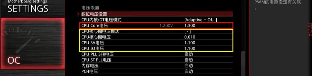 设置完了之后就需要调试电压了,如果是正常超频而不是为了跑出高分而去极限超频的话,那么IntelCPU的核心电压设置最好不要超过1.3V,如果散热足够可以后续还可以往下降。这里小鑫将核心电压设置成“1.3V”,为了不让电压过高,核心偏电压模式设置成“-”,核心偏电压设置“0.01”左右即可。SA电压和IO电压是和内存有关了,要更加内存的颗粒来设置,如果像三星比较吃电压的内存可以稍微设置高一点,小鑫用的是海力士的内存颗粒,所以就设置“1.1V”就可以了。