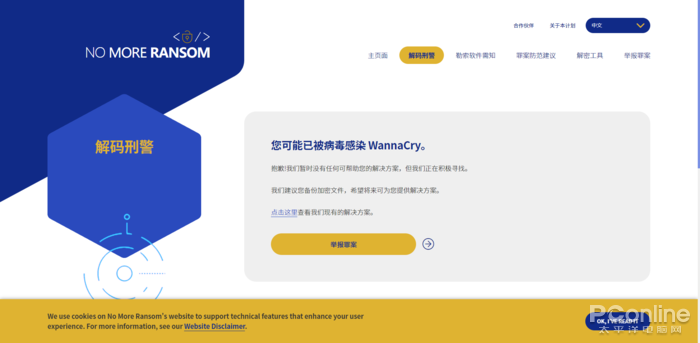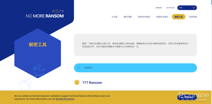 No more ransom收录了超过100种已知的勒索病毒,并且针对这些勒索病毒做了专门的解密工具。如果不幸中招的用户,可以尝试使用该网站里的“解码刑警”工具来识别所中的是何种勒索病毒,并且查询是否有解密工具。
