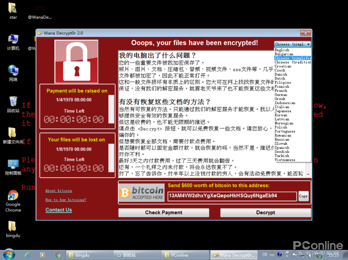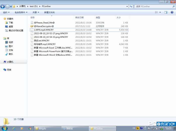 接下来,运行勒索病毒,静候片刻后,Windows桌面背景已经被病毒修改为勒索信背景图片。这个时候再进入PConline件夹中查看测试文件,PConline文件夹中的参与测试文件都已经被病毒进行加密操作,并修改后缀名为WNCRY。