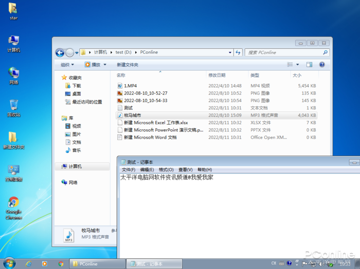 笔者先在虚拟机硬盘分区的PConline文件夹中准备了多种常见文件类型的文件,包含了文本文档及微软office系列文档、常见媒体文件格式文档、常见图片格式文档、常见压缩格式文档,具体测试文件请看下图。
