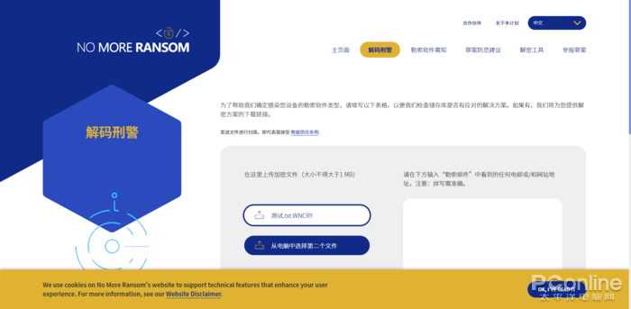 在这里,用户同样可以通过上传被加密文件的方式来查询是中了哪种勒索病毒,并可以尝试解密。