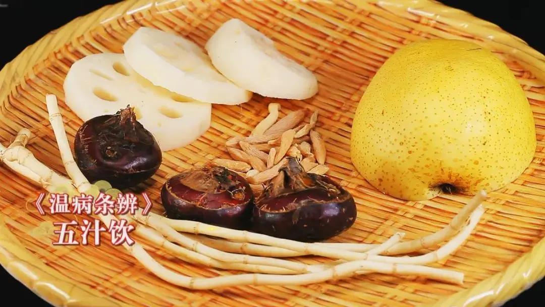 【做法】梨、莲藕、荸荠、芦根各一份,麦冬半份,放入破壁机打碎加热,即可做成生津养肺的五汁饮。