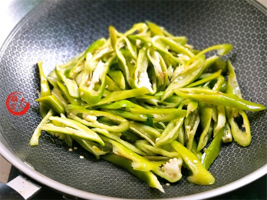 ④:起锅烧热,加入少量食用油晃锅润锅,中火下入切好的青辣椒快速炒匀至裹油,撒入1小勺盐炒匀调入底味,出锅备用。