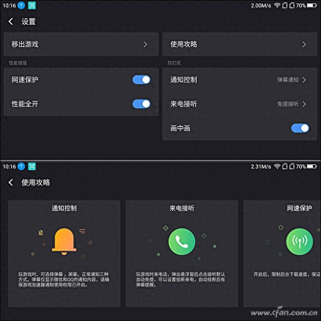 游戏加速器3.0在整合游戏性能专属优化、游戏免打扰、微信、QQ来信弹幕化、游戏中分屏快速回复和游戏录像功能外,还更新了界面UI,让游戏的选择和启动界面看起来更酷更便于操作。