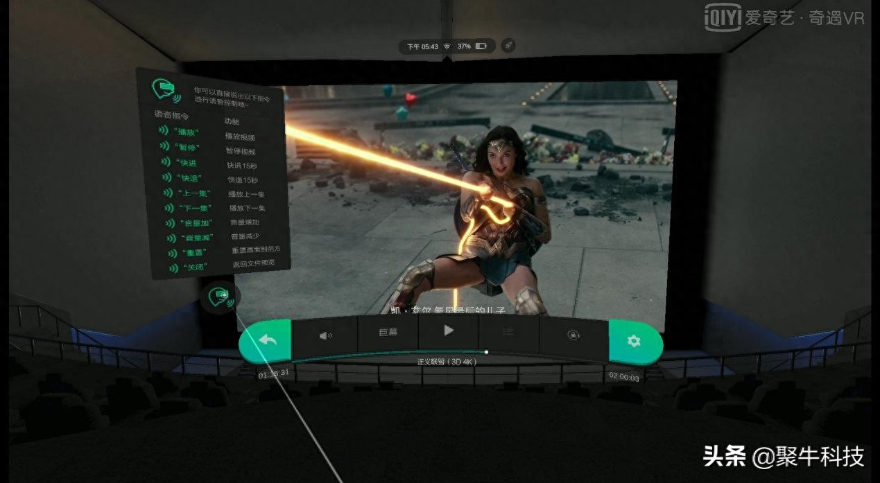 在进入iQUT未来影院观影后,我们会直接落座于影院中心的最佳观影位,而正前方就是42mm*23.5mm的近2000英寸Max巨幕,视觉效果相当养眼。这里需要注意的一点,以下奇遇2S投屏直出的展示截图画幅要大于人眼实际观影时所见的画幅,所以我们肉眼所看到的实际荧幕比例会更大更震撼,荧幕接近满屏。