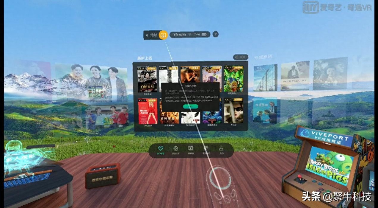 全篇文章中,所有右上角标有“爱奇艺·奇遇VR”水印的VR截图全部出自于奇遇2S的投屏功能,无论是GIF图还是截图画面。至于投屏操作非常简单,将奇遇2S和投屏设备连接至相同网络内,当然通过本地局域网投屏也可以,唯一的区别就是不能联网。