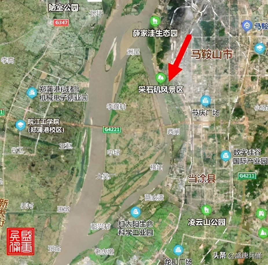 导游讲,要看采石矶的全貌,其实应该在江的对面看。所谓江对面也不是长江的对面,而是长江水中的一个渚(水中间的小块陆地),如下图所示。国道4221横贯东西,因此马鞍山的过江大桥有两座:一座斜拉桥,一座吊索桥,这样才跨过了长江中的这块陆地——江心洲(太白岛)(现当涂县江心乡)。