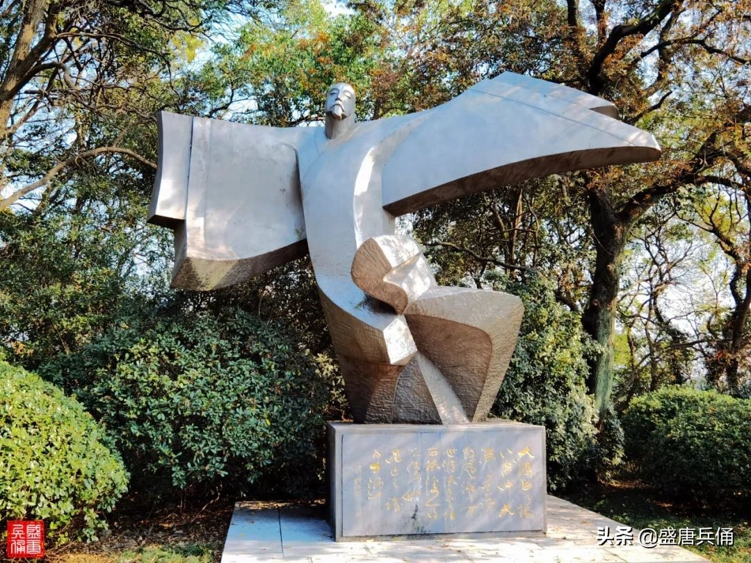 联璧台旁的李白塑像,为纪念李白逝世1225周年而立(1987年),高约2米,合金钢制成,由雕塑家钱绍武创作。诗仙似大鹏展翅,意欲升天。