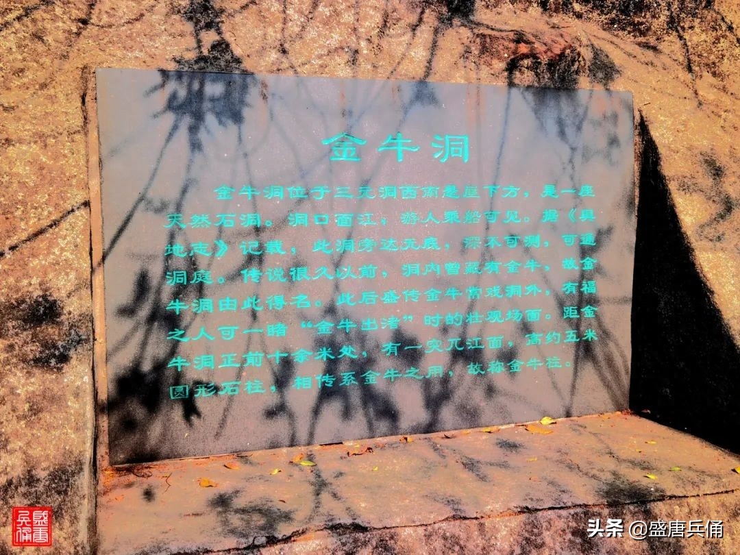 金牛洞是采石矶5个天然洞穴之一,位于三元洞悬崖下方,洞口面江。如果在江面上乘船即能看到。传说洞内藏有金牛,故金牛洞由得名。但是要爬下爬上的(下图),导游劝我们还是不要下去看了。