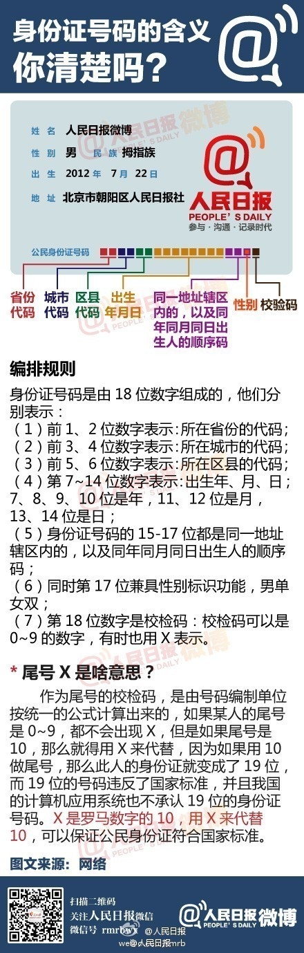 1984年4月6日,中国开始实行居民身份证制度。1999年10月1日,《国务院关于实行公民身份号码制度的决定》实施。身份证号码的含义,你都了解吗?最后一位神秘X代表什么?最全身份证号码说明,戳图了解!
