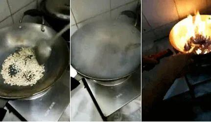 版本三:一名女子将一碗大米倒入锅内加热生炒至金黄色,再到焦黑。随后,该女子点燃这些焦黑色的大米,声称“大米是塑料做的”。