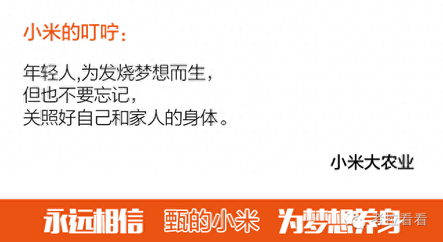 在消费者定位方面,其定位和小米手机一致,针对年轻人推出。小米的口号是“年轻人的第一台智能手机”,提倡“为发烧而生”的热情。而“甄的小米”的口号就是“年轻人的第一袋养生小米”,我们在为青春梦想奋斗的时候,也要“为梦想养生”。
